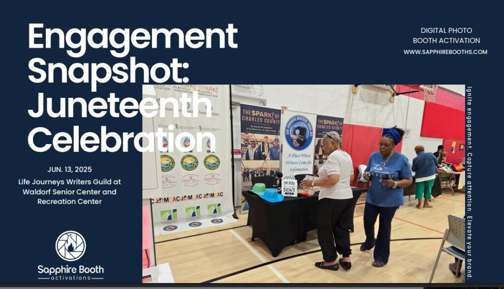As part of the Life Journeys Writers Guild’s six-week traveling exhibition, titled SPARK! Places of Innovation—a Smithsonian Institute and Maryland Humanities project, we featured Sapphire’s Photo Booth at one of our exhibitions and its 360 Photo Booth at another site!!! It drew crowds like flies!!! Folks enjoying the Photo Booth experience then asked what was the exhibition about/what did it entailed—which was to highlight the rural areas and ingenuity of Charles County, Maryland!!! They were all ears and had loads of fun!!! And we made history by instituting the Photo Booths!!! Nothing like that had been done before!!! I can’t wait to do it again!!! Sapphire Booth Activations, the outfit, was professional, engaging, totally focused on our mission, top notch and tech savvy!!!!